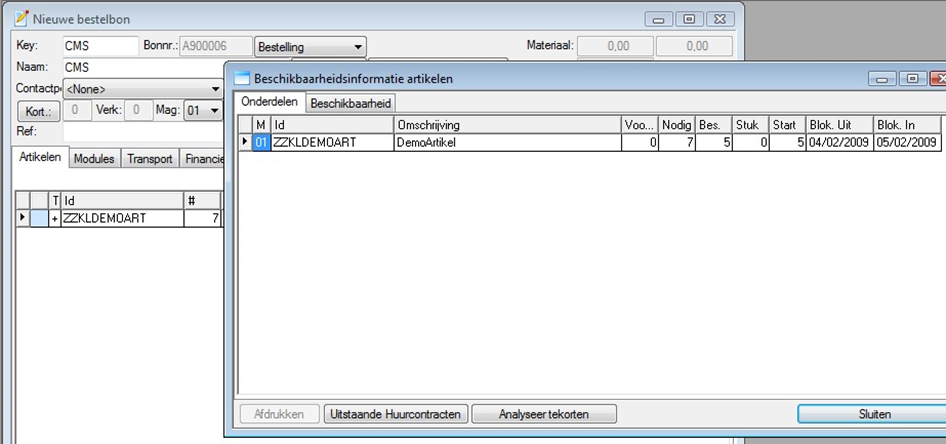 De beschikbaarheid van een samengesteld artikel wordt getest door dit artikel op te splitsen in zijn enkelvoudige onderdelen en deze één voor één te testen. Hierdoor geeft u dus ook geen aantallen in bij de definitie van een product. U heeft immers maximaal dat aantal van producten in voorraad als kan samengesteld worden uit zijn basiscomponenten.